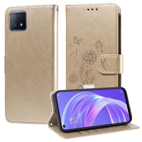 Funda de Cuero con Diseño de Mariposas y Flores En Relieve para Oppo A92S/A53 5G/A72 5G/A73 5G (Dorada)