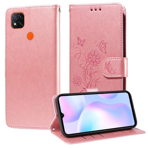 Funda de Cuero con Diseño de Mariposas y Flores En Relieve para Redmi 10A 4G (Oro Rosa)