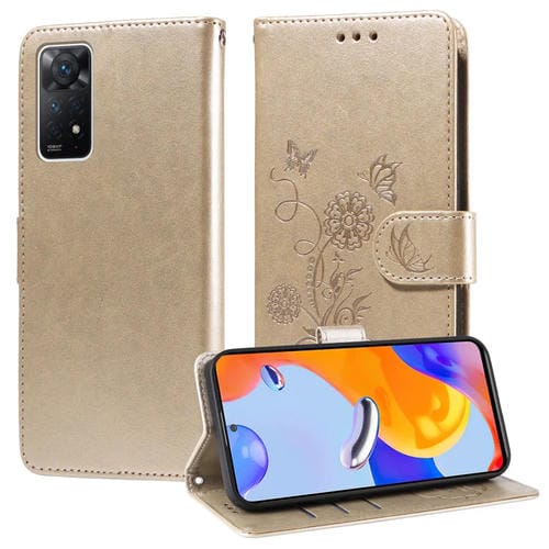 Funda de Cuero con Diseño de Mariposas y Flores En Relieve para Redmi Note 12 Pro 4G (Dorada)