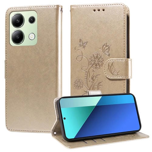 Funda de Cuero con Diseño de Mariposas y Flores En Relieve para Redmi Note 13 4G (Dorada)