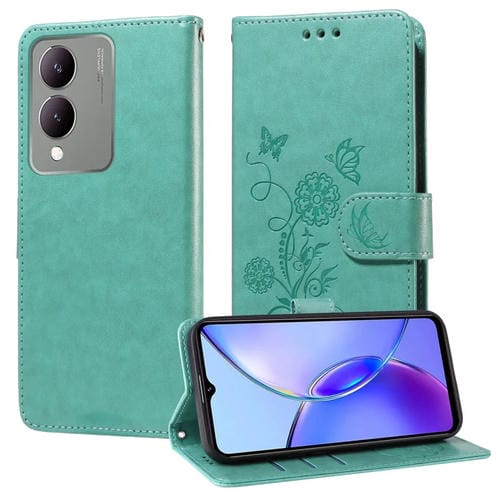 Funda de Cuero con Diseño de Mariposas y Flores En Relieve para Vivo Y17S / Y36I 5G / Y28 5G (Verde)