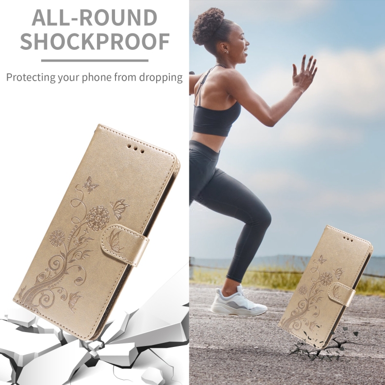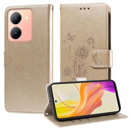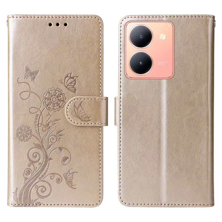 Funda de Cuero con Diseño de Mariposas y Flores En Relieve para Vivo Y36 4G/5G (Dorada)