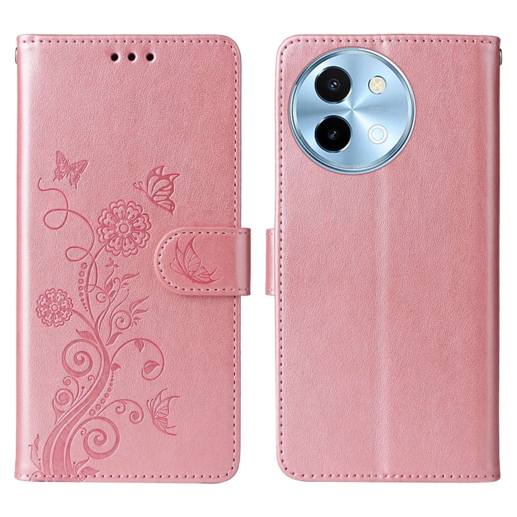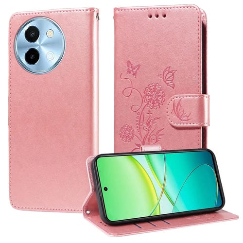 Funda de Cuero con Diseño de Mariposas y Flores En Relieve para Vivo Y38 5G / T3X 5G (Oro Rosa)