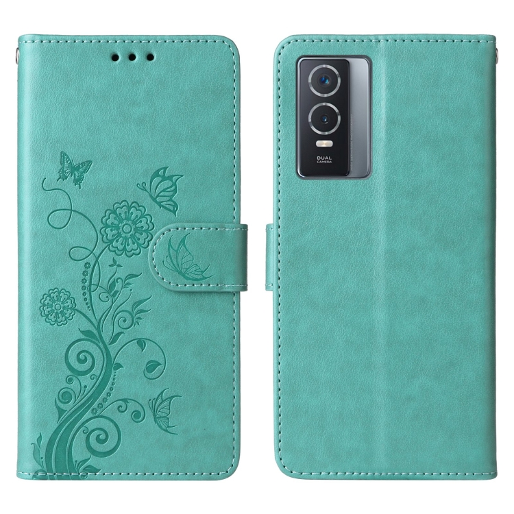 Funda de Cuero con Diseño de Mariposas y Flores En Relieve para Vivo Y76 5G/Y76S (Verde)
