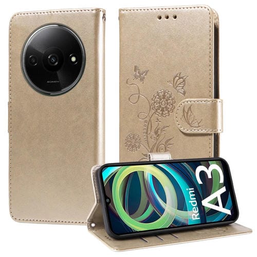 Funda de Cuero con Diseño de Mariposas y Flores En Relieve para Xiaomi Poco C61 4G/Redmi A3 4G (Dorada)