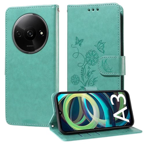 Funda de Cuero con Diseño de Mariposas y Flores En Relieve para Xiaomi Poco C61 4G/Redmi A3 4G (Verde)