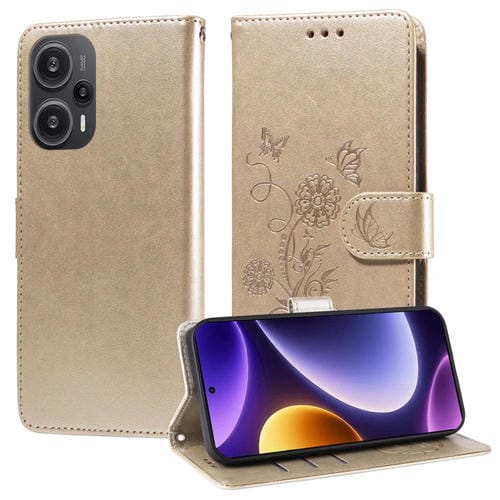 Funda de Cuero con Diseño de Mariposas y Flores En Relieve para Xiaomi Poco F5/Redmi Note 12 Turbo (Dorada)