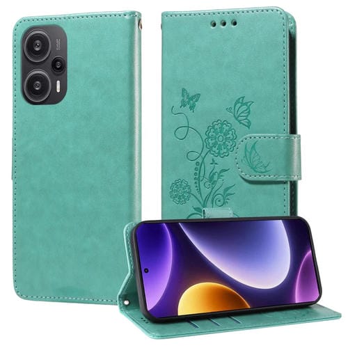 Funda de Cuero con Diseño de Mariposas y Flores En Relieve para Xiaomi Poco F5/Redmi Note 12 Turbo (Verde)