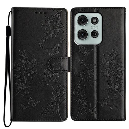 Funda de Cuero para Motorola Moto G75 5G con Diseño de Mariposas y Flores (Negra)