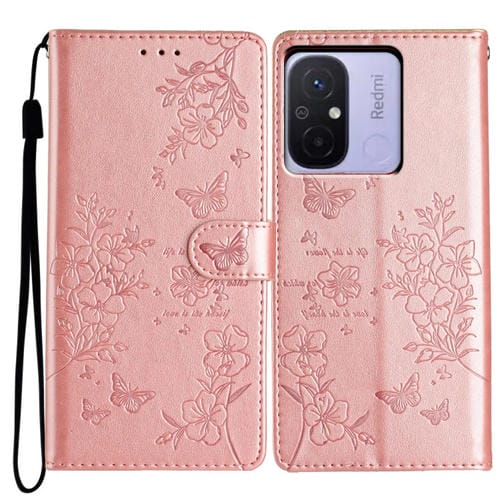 Funda de Cuero con Diseño de Mariposas y Flores para Redmi 12C (Oro Rosa)