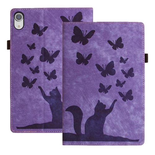 Funda de Cuero para iPad Mini 2024/2021 con Estampado de Mariposas y Gatos (Morado)