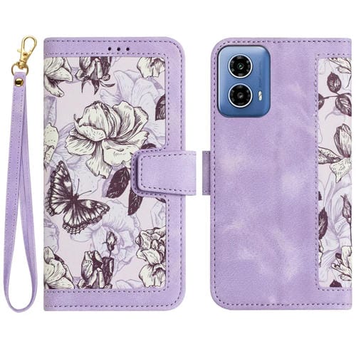 Funda de Cuero con Estampado Floral para Motorola Moto G 5G (2024) con Cordón (Morado Claro)