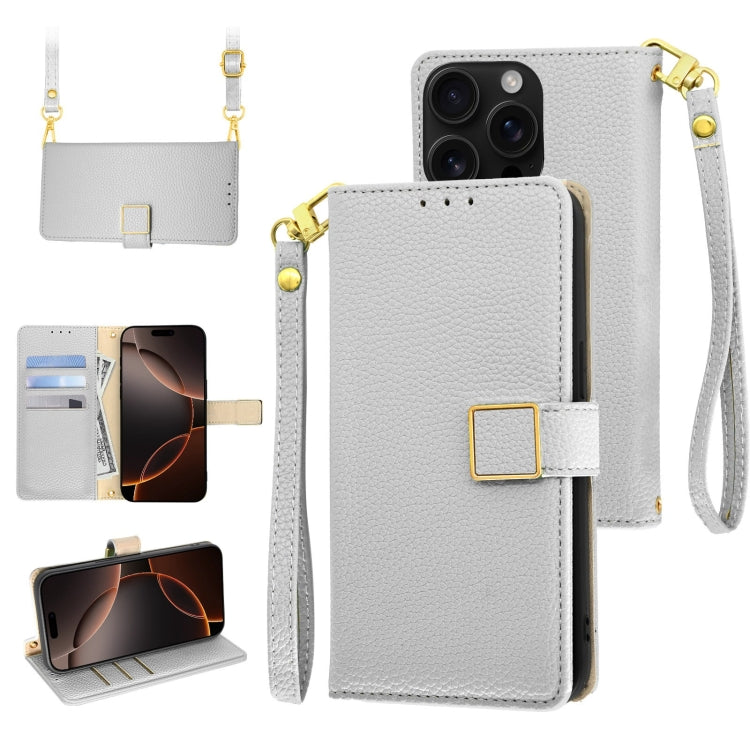Funda de Cuero con Hebilla Cuadrada y Textura de Lichi Cruzada para iPhone 16 Pro Max (Plateada)