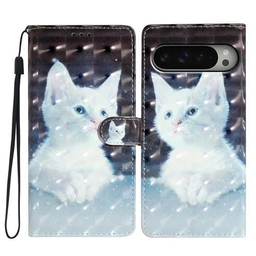 Funda de Cuero con Patrón 3D para Google Pixel 9 Pro XL (Gato Blanco)