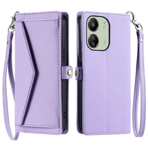 Funda de Cuero con Ranura para Múltiples Tarjetas y Cordón para Redmi 13C 4G/5G (Morado)