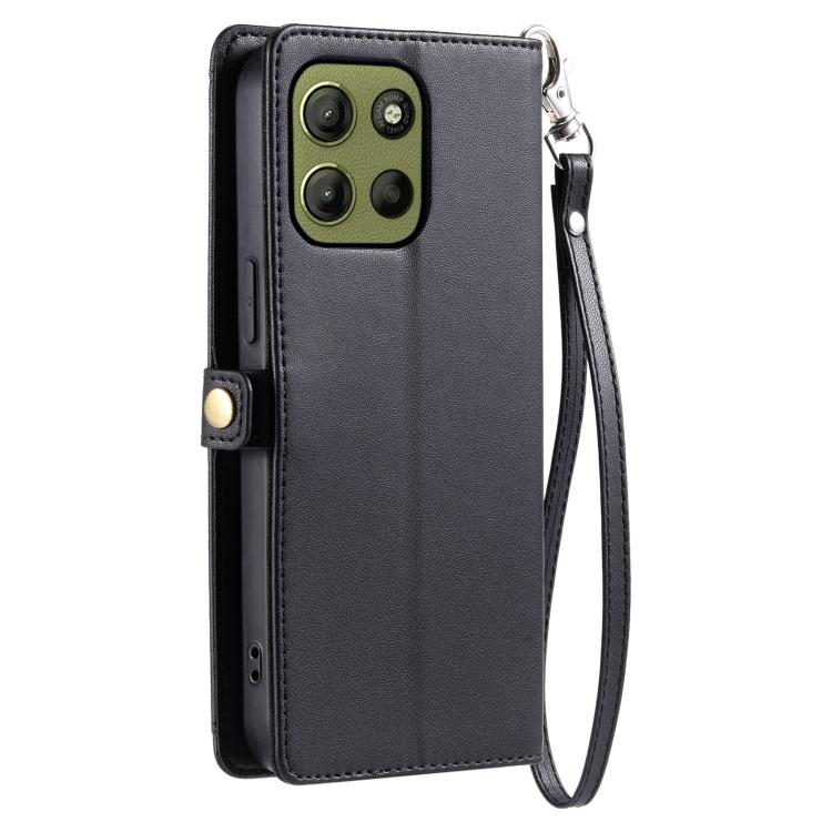Funda de Cuero para Motorola Moto G15 con Ranura para Tarjetas y Cordón (Negro)