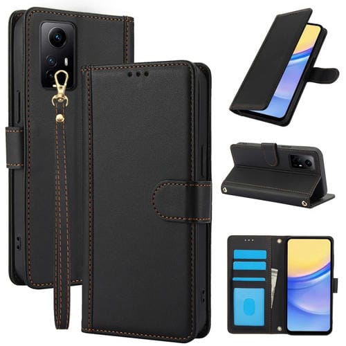 Funda de Cuero con Ranuras para Tarjetas y Tacto de Piel Global para Redmi Note 11 4G/Note 12S 4G con Cordón Doble (Negro)