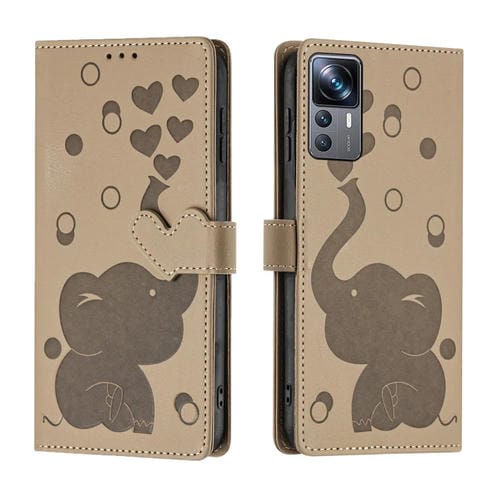 Funda de Cuero con Relieve de Elefante de Dibujos Animados para Xiaomi 12T/12T Pro (Caqui)