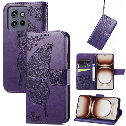 Funda de Cuero con Relieve Mariposa y Flor para Motorola Edge 50 Neo (Morado Oscuro)