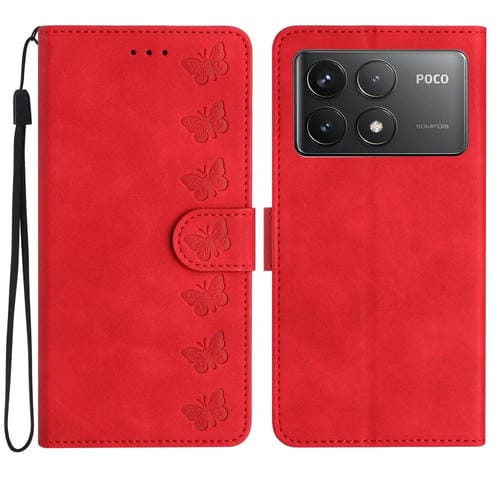 Funda de Cuero con Relieve de Siete Mariposas para Xiaomi Poco F6 Pro (Rojo)