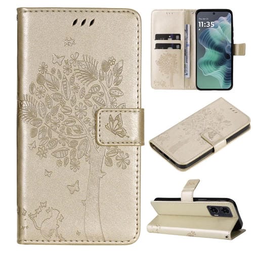 Funda de Cuero con Tapa para Motorola Moto G35 con Diseño Árbol y Gato en Relieve (Dorada)