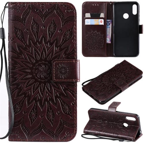 Funda de Cuero con Tapa Horizontal Estampado Sol para Huawei Honor Play 8A Y6 (2019) con Ranura Tarjeta Soporte Billetera Cordón (Marrón)