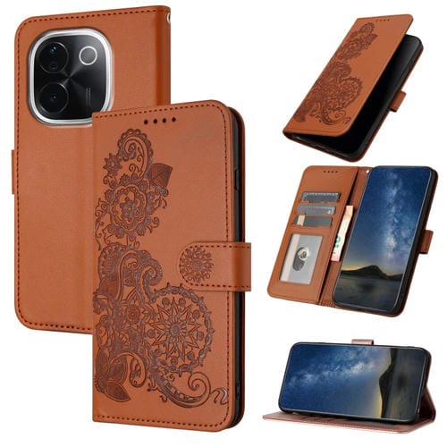 Funda de Cuero con Tapa para Teléfono con Diseño de Flor de Datura En Relieve de la India para Vivo Iqoo Z9S Pro/T3 Pro 5G (Marrón)