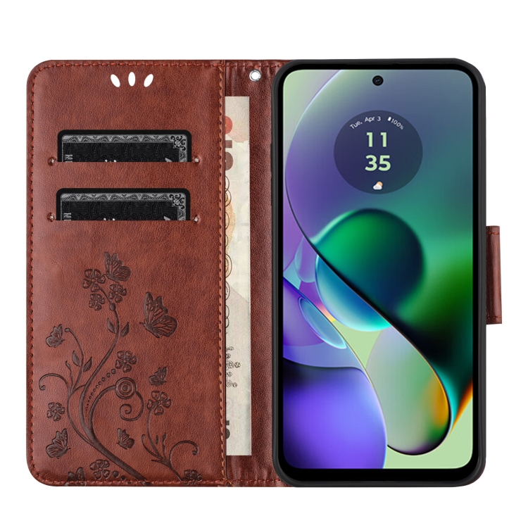 Funda de Cuero con Tapa para Motorola Moto G35 con Diseño de Flores y Mariposas (Marrón)