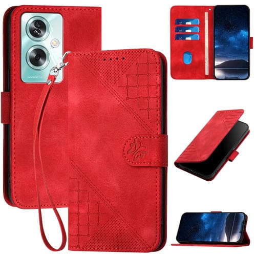 Funda de Cuero con Tapa y Cordón para Oppo A79 5G Global Yx0080 con Diseño En Relieve de Mariposa y Cuadrícula (Rojo)