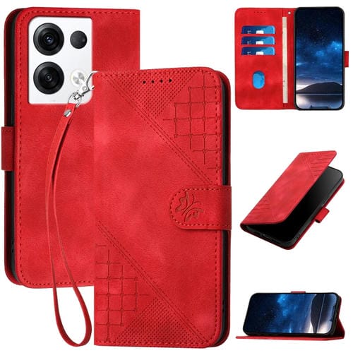 Funda de Cuero con Tapa y Cordón para Oppo Reno8 Pro 5G Global Yx0080 con Diseño En Relieve de Mariposa y Cuadrícula (Rojo)