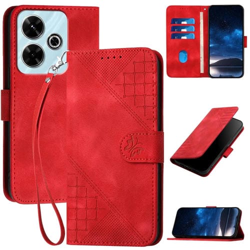 Funda de Cuero con Tapa y Cordón para Redmi 13 Yx0080 con Diseño En Relieve de Mariposa y Cuadrícula (Rojo)
