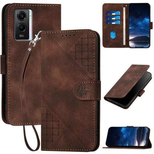 Funda de Cuero con Tapa y Cordón para Vivo T1 5G Global Yx0080 con Diseño En Relieve de Mariposa y Cuadrícula (Café)