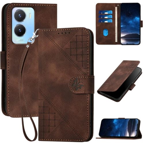 Funda de Cuero con Tapa y Cordón para Vivo Y02S 4G Global Yx0080 con Diseño En Relieve de Mariposa y Cuadrícula (Café)