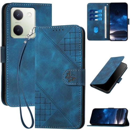 Funda de Cuero con Tapa y Cordón para Vivo Y100 5G Global Yx0080 con Diseño En Relieve de Mariposa y Cuadrícula (Azul Oscuro)