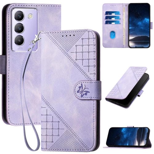 Funda de Cuero con Tapa y Cordón para Vivo Y200E 5G Global Yx0080 con Diseño En Relieve de Mariposa y Cuadrícula (Morado Claro)