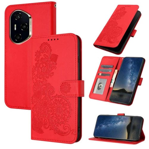 Funda de Cuero con Tapa y Flor de Datura en Relieve para Honor 300 Pro y 300 Ultra (Rojo)
