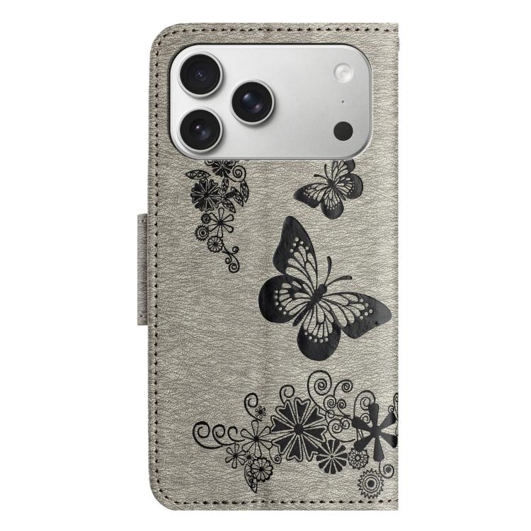 Funda de cuero con tapa y diseño de mariposas en relieve para iPhone 17 Pro (gris)