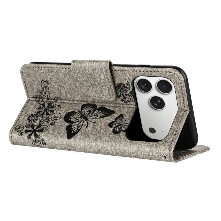 Funda de cuero con tapa y diseño de mariposas en relieve para iPhone 17 Pro Max (gris)