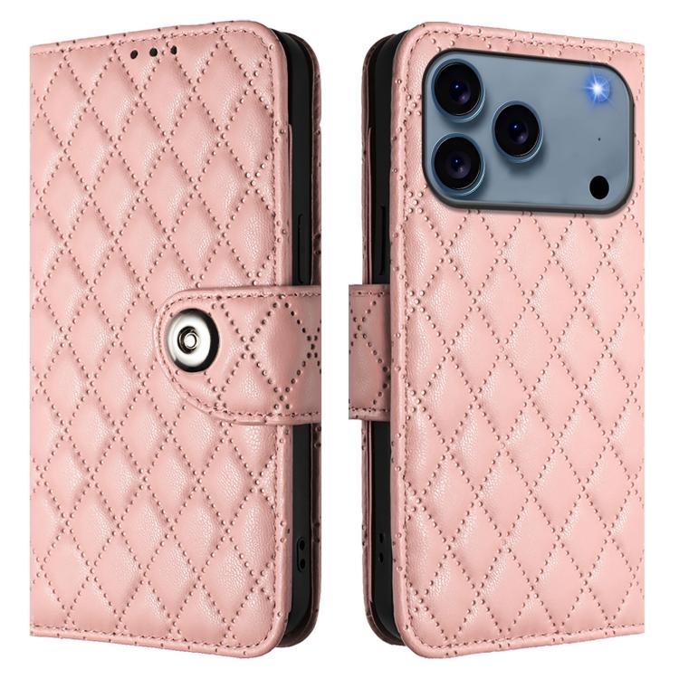 Funda de cuero con textura rómbica y cordón para iPhone 17 Pro Max (rosa coral)