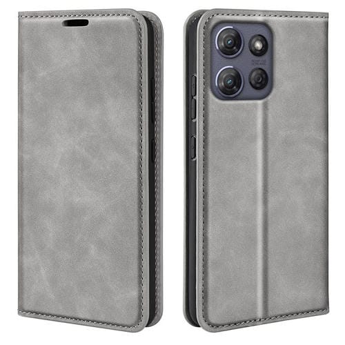 Funda de Cuero con Ventosa Magnética para Motorola Moto G Power 2025 (Gris) Retro-Skin
