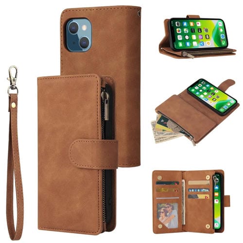 Funda de Cuero para Teléfono iPhone 13 Mini Multifuncional con Ranura para Tarjeta Soporte Billetera Cremallera Marco de Fotos (Brown)