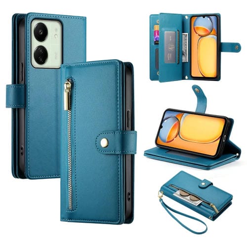 Funda de Cuero para Teléfono con Nueve Ranuras para Tarjetas y Cremallera para Redmi 13R/Xiaomi Poco M6 (Azul)