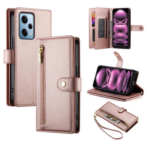 Funda de Cuero para Teléfono con Nueve Ranuras para Tarjetas y Cremallera para Redmi Note 12 Pro / Xiaomi Poco X5 Pro (Rosa)
