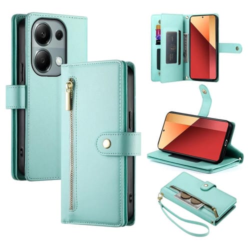 Funda de Cuero para Teléfono con Nueve Ranuras para Tarjetas y Cremallera para Redmi Note 13 Pro 4G/Xiaomi Poco M6 Pro (Verde Menta)
