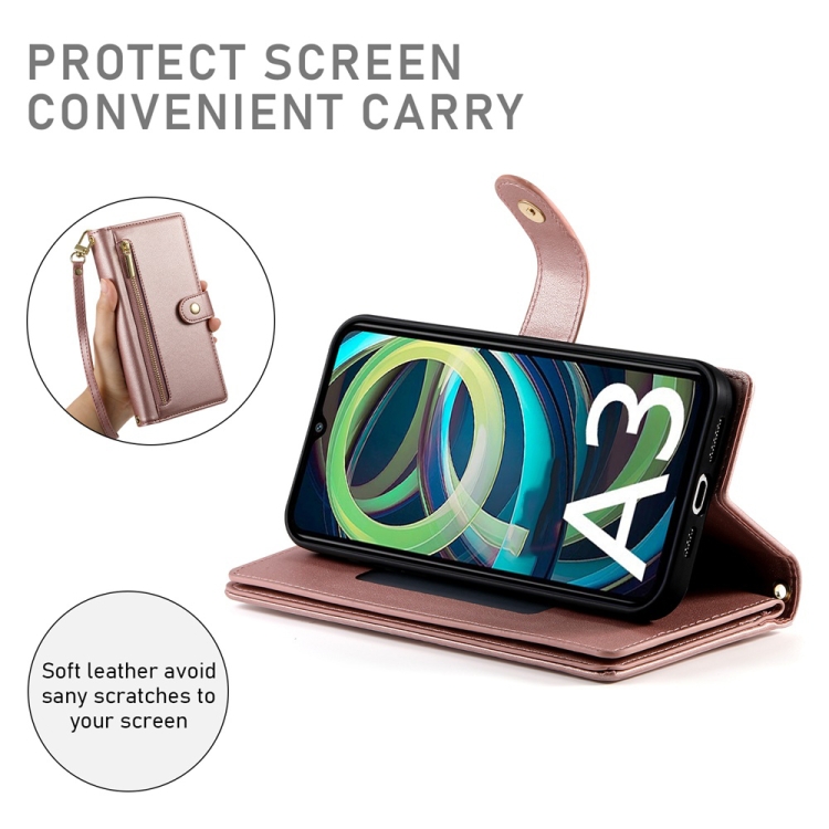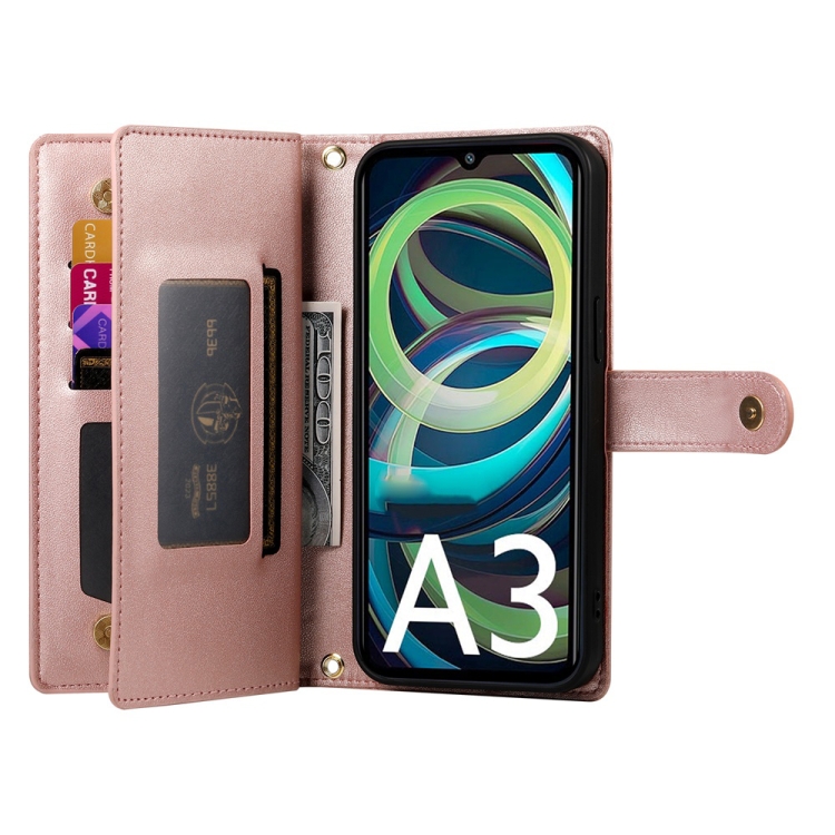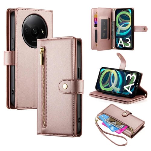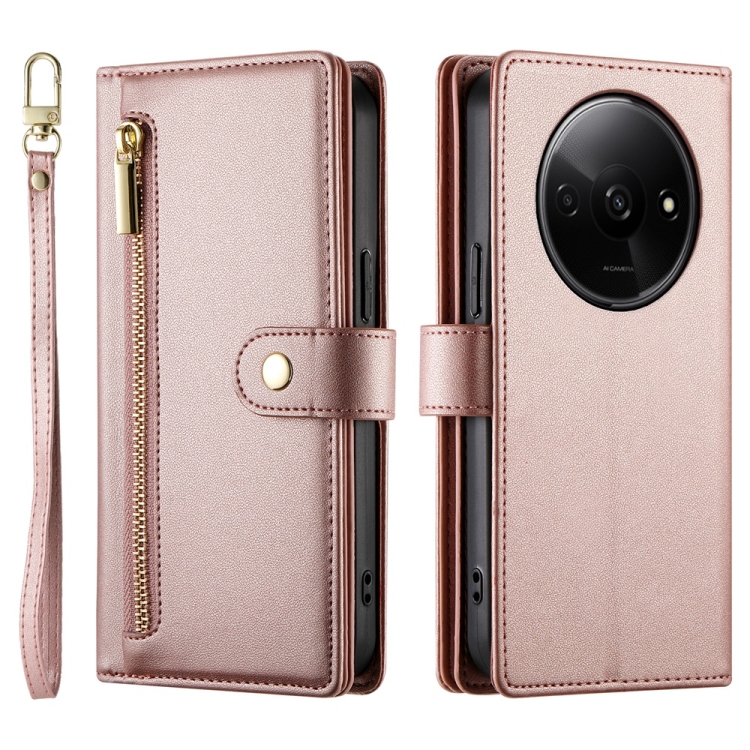 Funda de Cuero para Teléfono Redmi A3 con Nueve Ranuras para Tarjetas y Cremallera (Rosa)