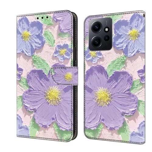 Funda de Cuero Pintada a Mano para Redmi Note 12 4G Global Fresh Painted Phone Case (Pintura al Óleo con Flores Moradas)