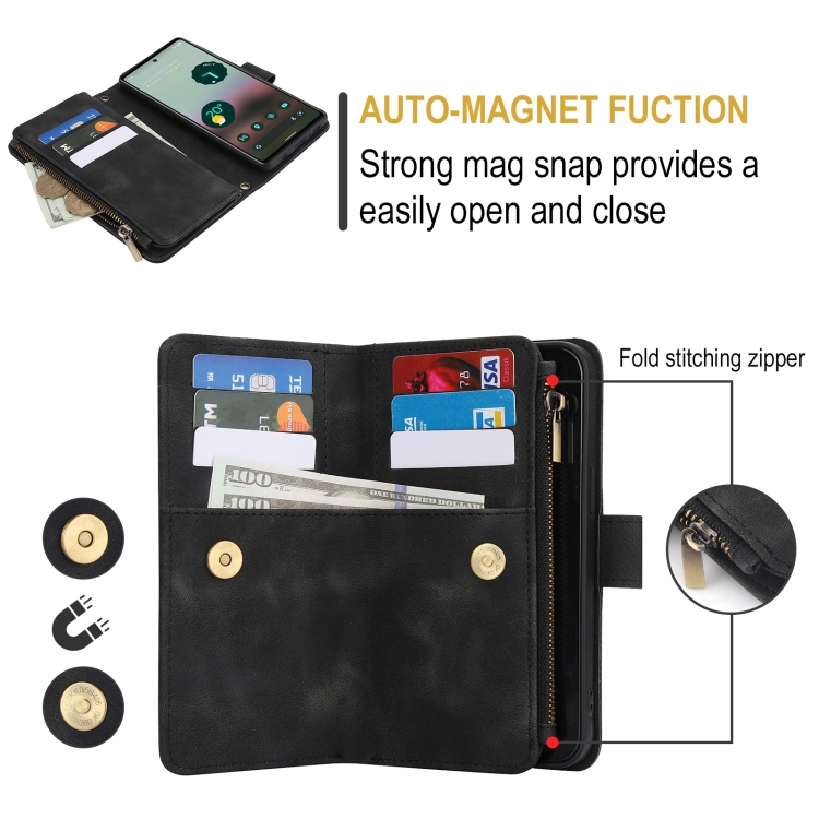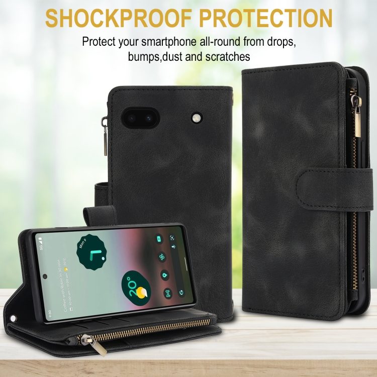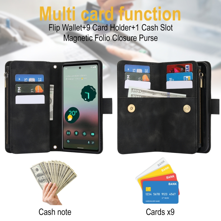 Funda de Cuero Rfid con Cremallera para Google Pixel 6 Dream con 9 Tarjetas y Cordón (Negro)
