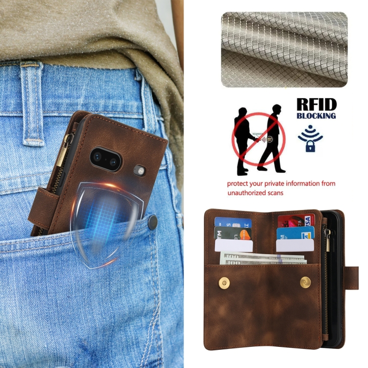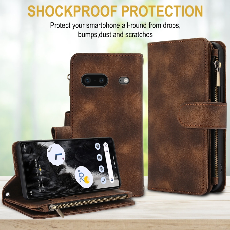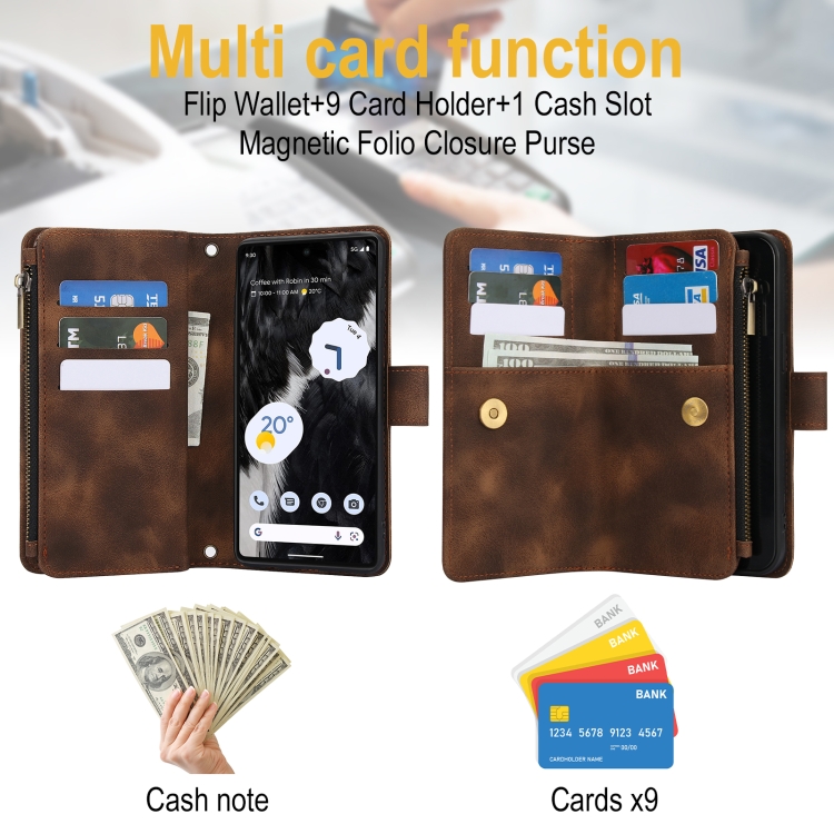 Funda de Cuero Rfid con Cremallera para Google Pixel 7 Dream con 9 Tarjetas y Cordón (Marrón)