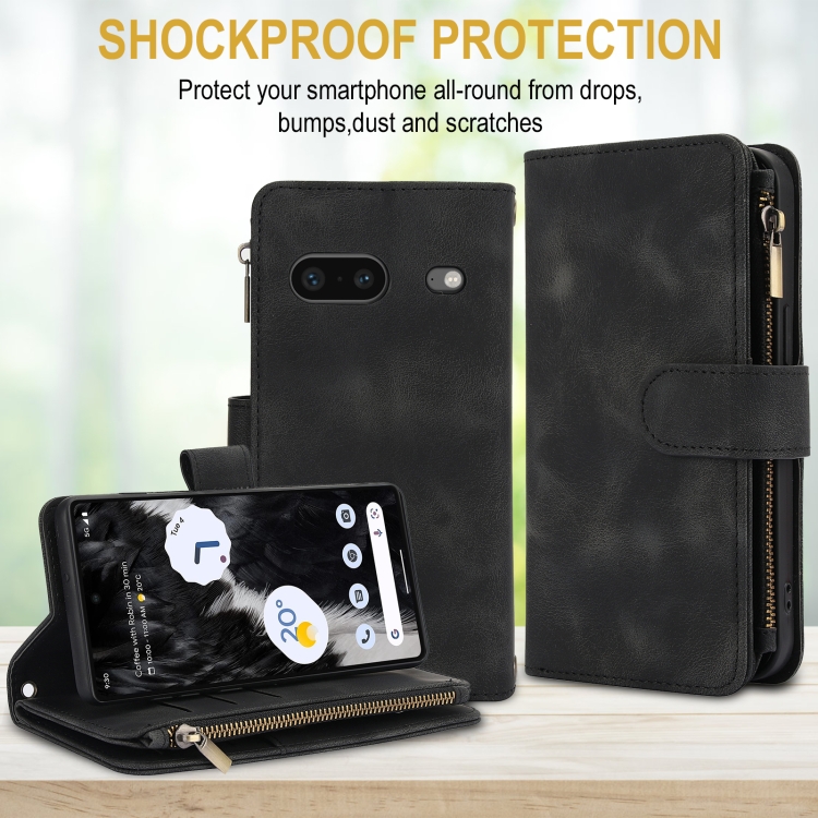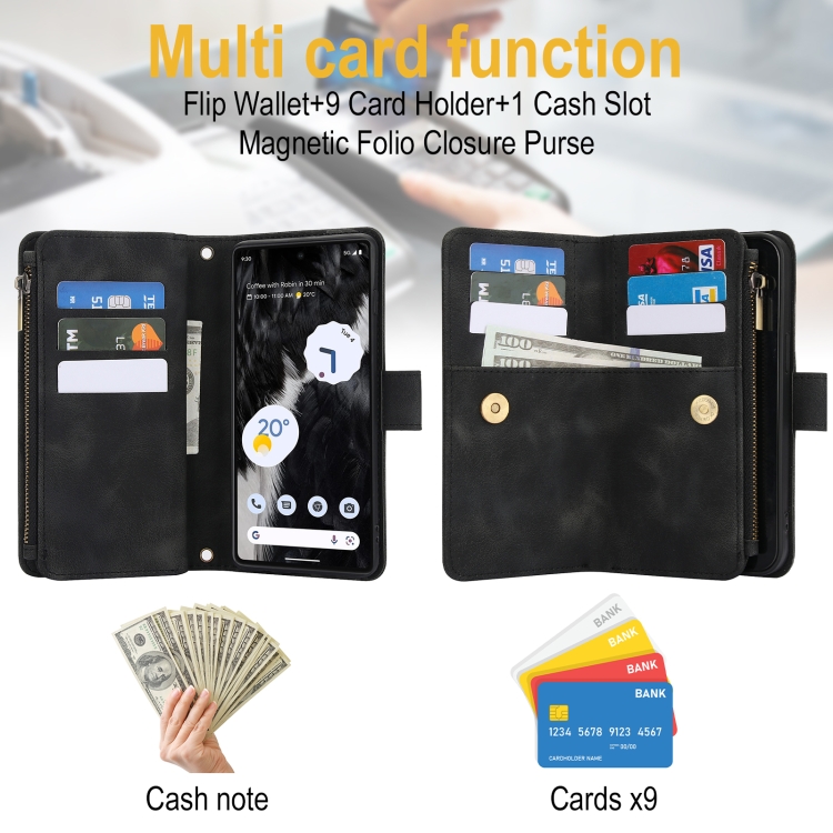Funda de Cuero Rfid con Cremallera para Google Pixel 7 Dream con 9 Tarjetas y Cordón (Negro)