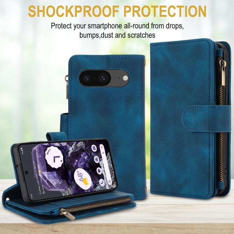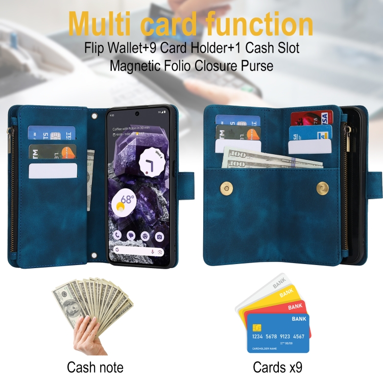 Funda de Cuero Rfid con Cremallera y Cordón para Google Pixel 8 Dream con 9 Tarjetas (Azul)